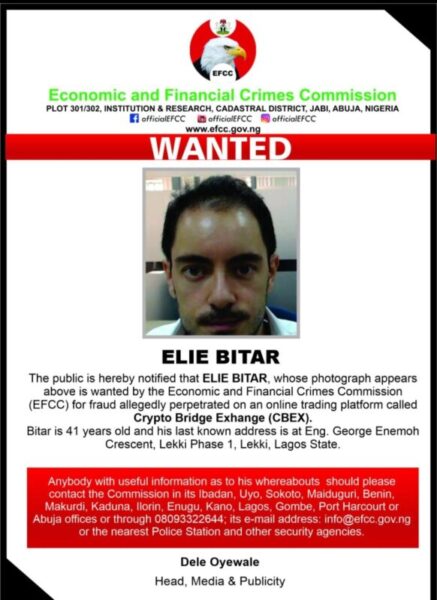 The public is hereby notified that ELIE BITAR…is wanted by the Economic and Financial Crimes Commission (EFCC) for fraud allegedly perpetrated on an online trading platform called Crypto Bridge Exchange (CBEX),” stated the official EFCC bulletin.