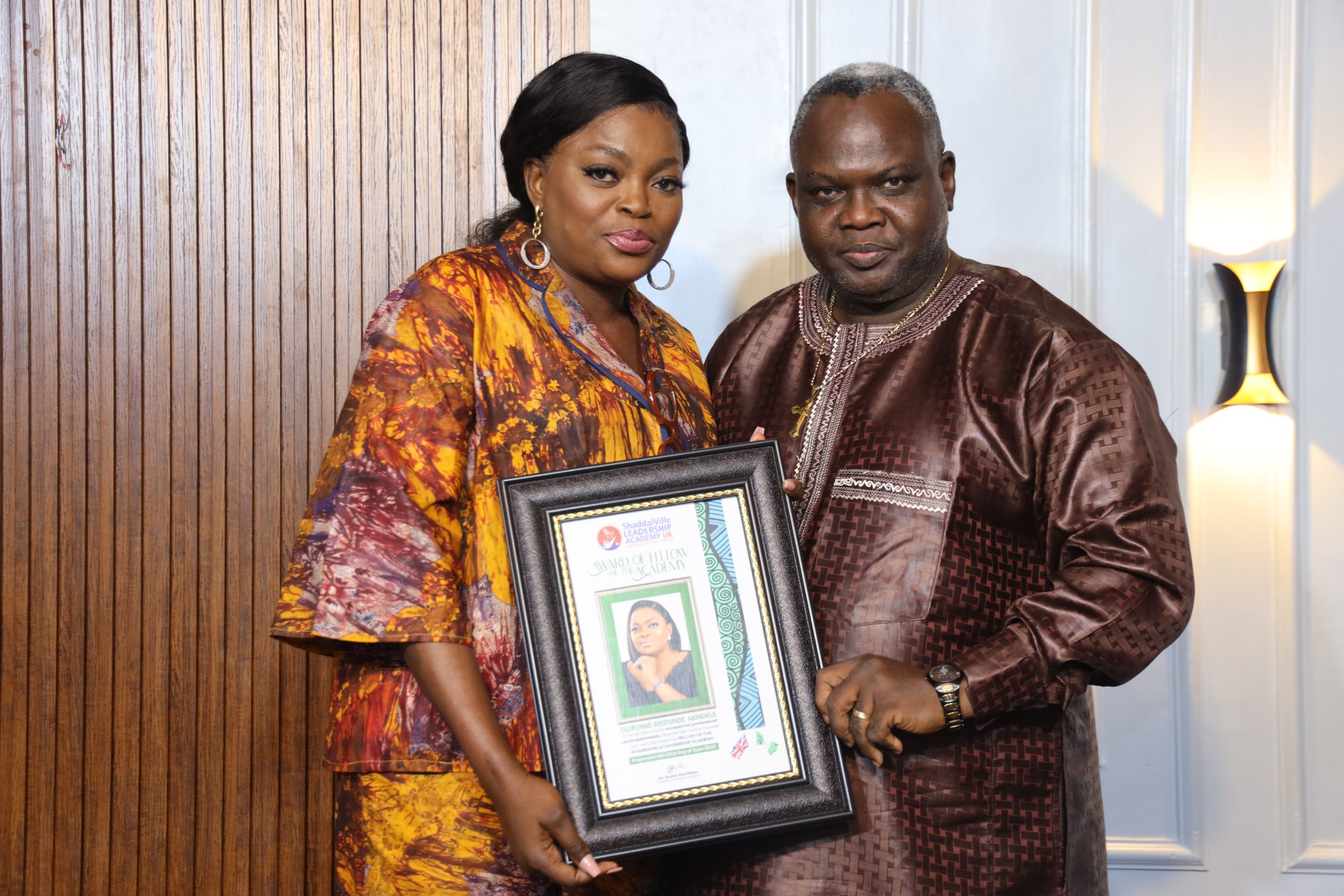 Nollywood superstar Funke Akindele aka ‘Jenifa’ has been presented with the award of Fellow of the ShaddaiVille Leadership Academy. The award plaque was presented to her on Sunday June 25, 2023 by Taiwo Oladele Hamilton, wife of the President, ShaddaiVille Ministries International, during the 22nd graduation ceremony of the global leadership academy.