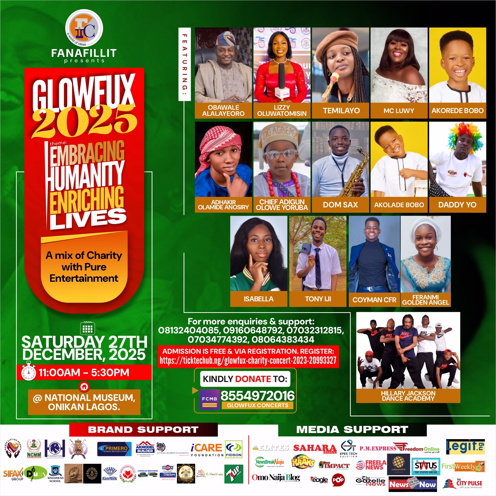 Registration, donations, and event details are available via https://linktr.ee/glowfux, with direct donations accepted at FCMB Account 8554972016, GLOWFUX Concert.