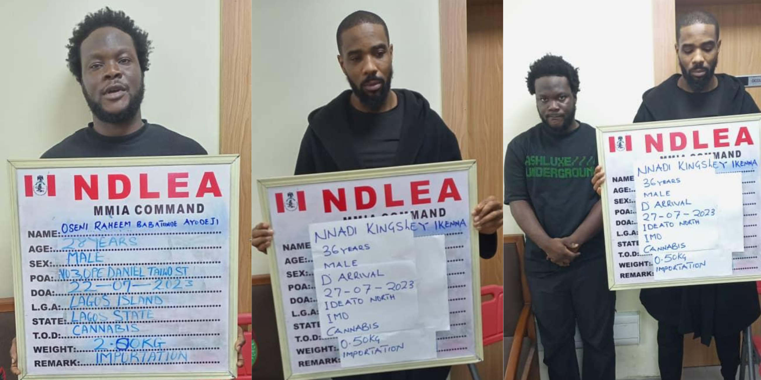 Their arrest followed an intelligence about a shipment of Colorado, a synthetic strong strain of cannabis coming for them from Los Angeles, United States.